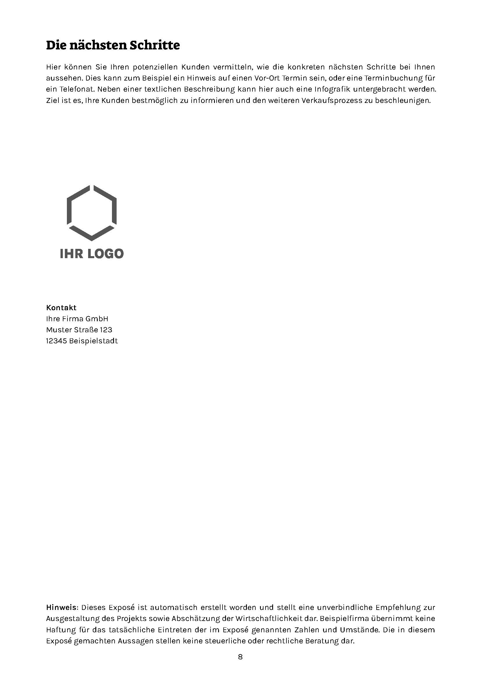 Am Ende jeder Konfiguration entsteht ein automatisch generiertes Exposé: Visualisierung, technische Kennzahlen, Wirtschaftlichkeitsrechnung und CO₂-Ersparnis inklusive. Ideal zur Angebotsvorbereitung oder direkten Kundenkommunikation.